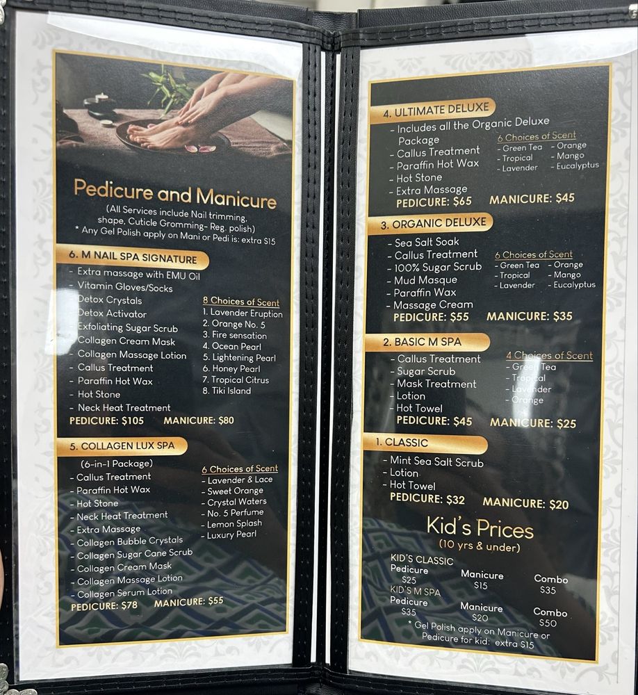 M Nail Spa offers amenities such as Accepts Contactless Payments, ensuring a comfortable and convenient experience for clients.